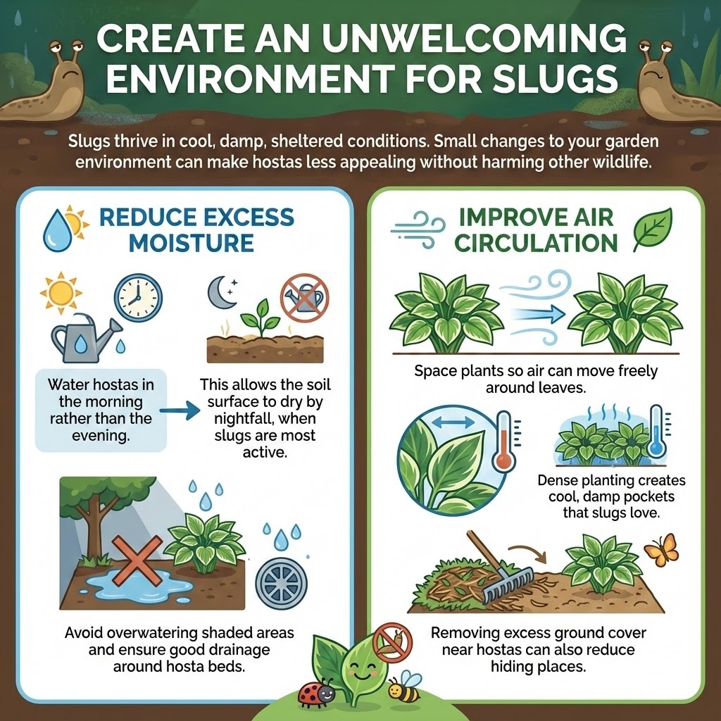 Slugs thrive in cool, damp, sheltered conditions. Small changes to your garden environment can make hostas less appealing without harming other wildlife.