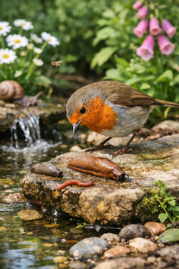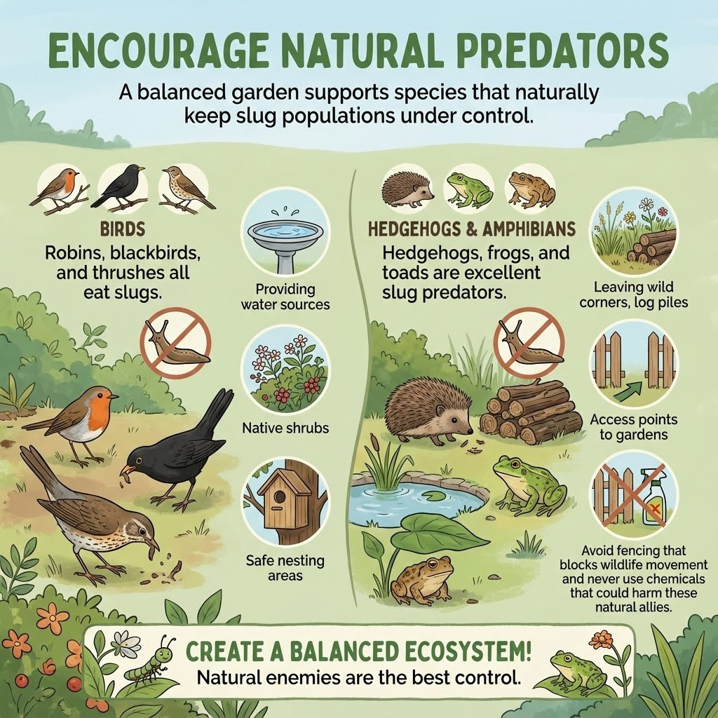 Robins, blackbirds, and thrushes all eat slugs. Providing water sources, native shrubs, and safe nesting areas encourages them to visit regularly.