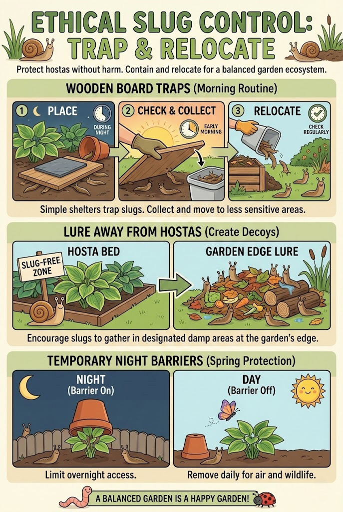 Ethical slug control focuses on containment and relocation, not killing. These methods reduce damage to hostas while allowing slugs and snails to remain part of the garden ecosystem.