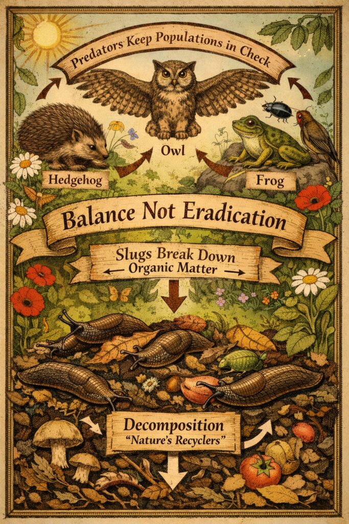 Slugs and snails play a role in breaking down organic matter and supporting soil health. The goal is not eradication, but balance.