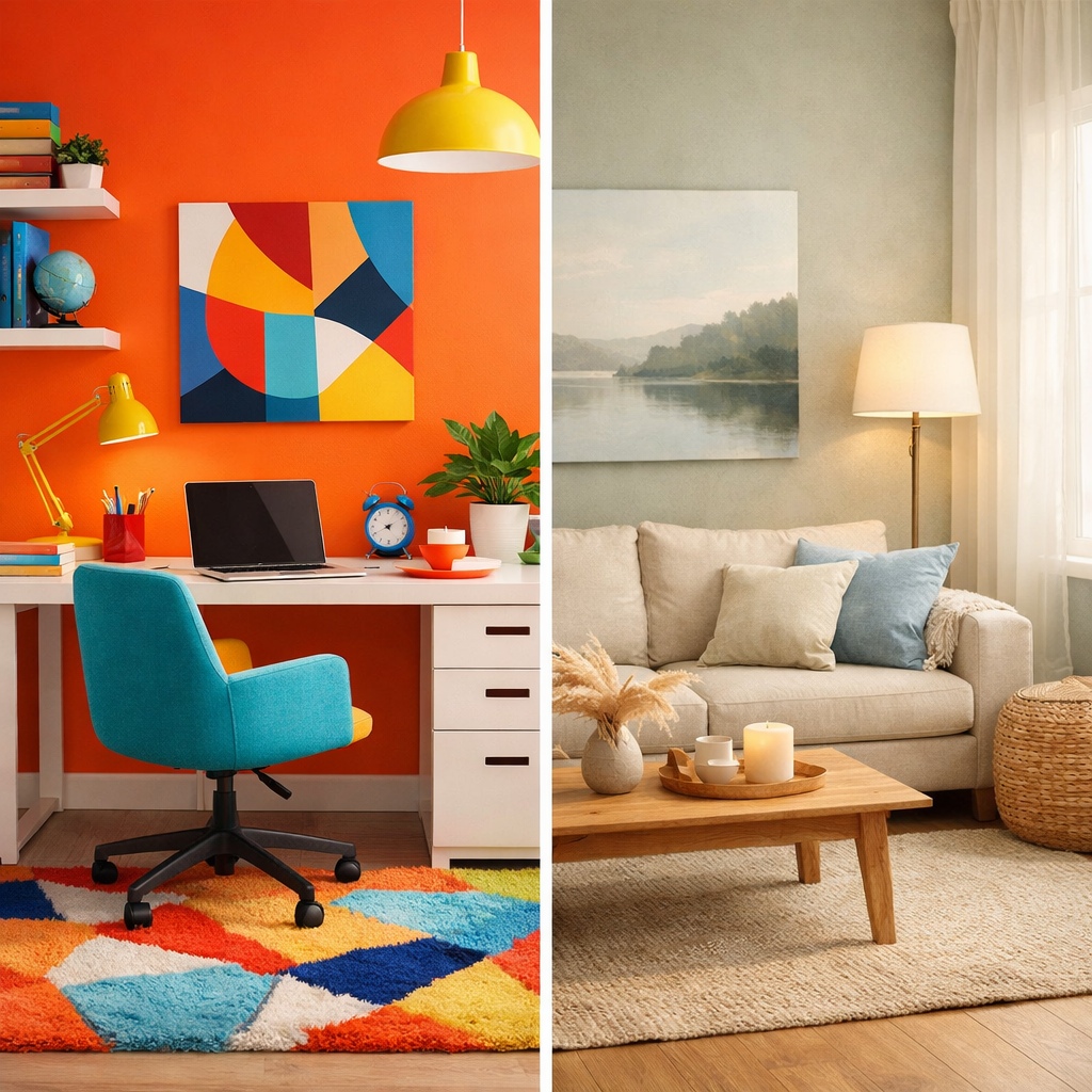 Warm colours such as red, orange, and yellow tend to stimulate the nervous system. They can feel welcoming and energising, but in excess they may create restlessness or visual fatigue.