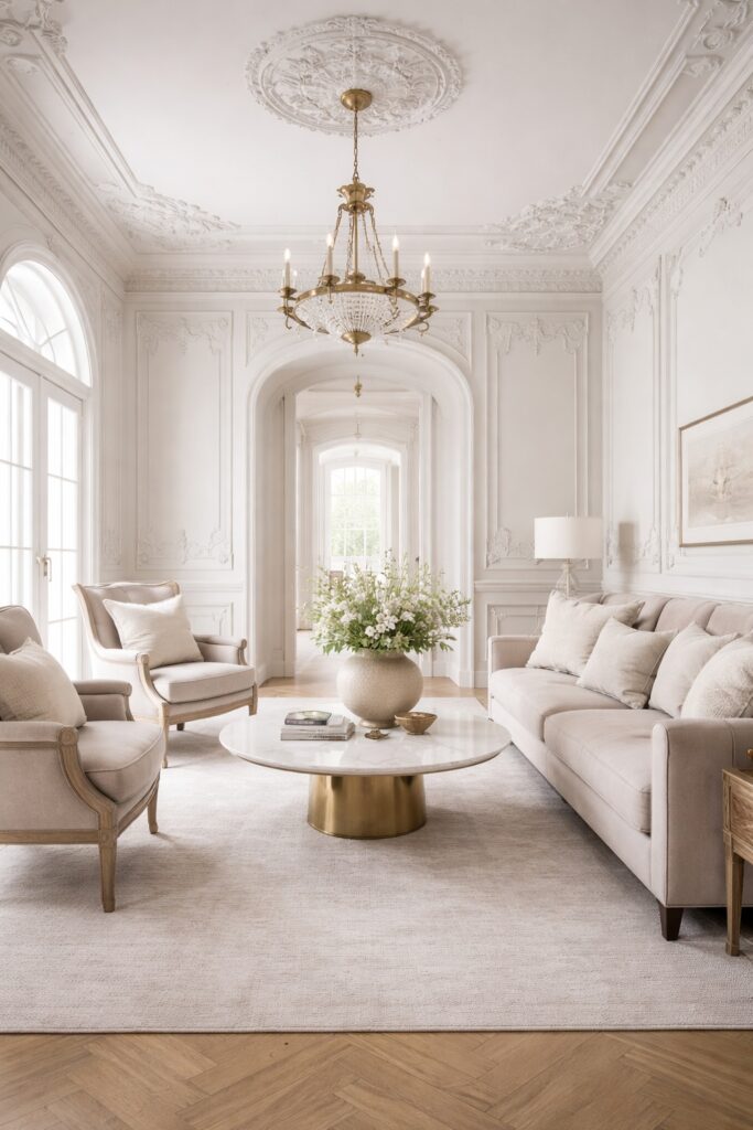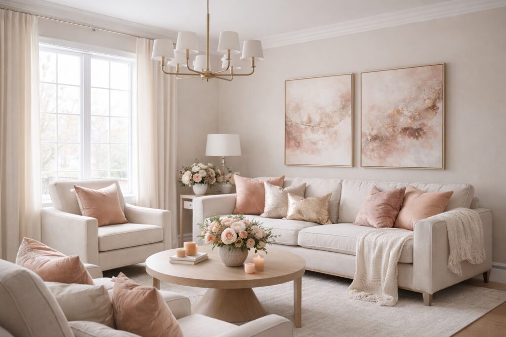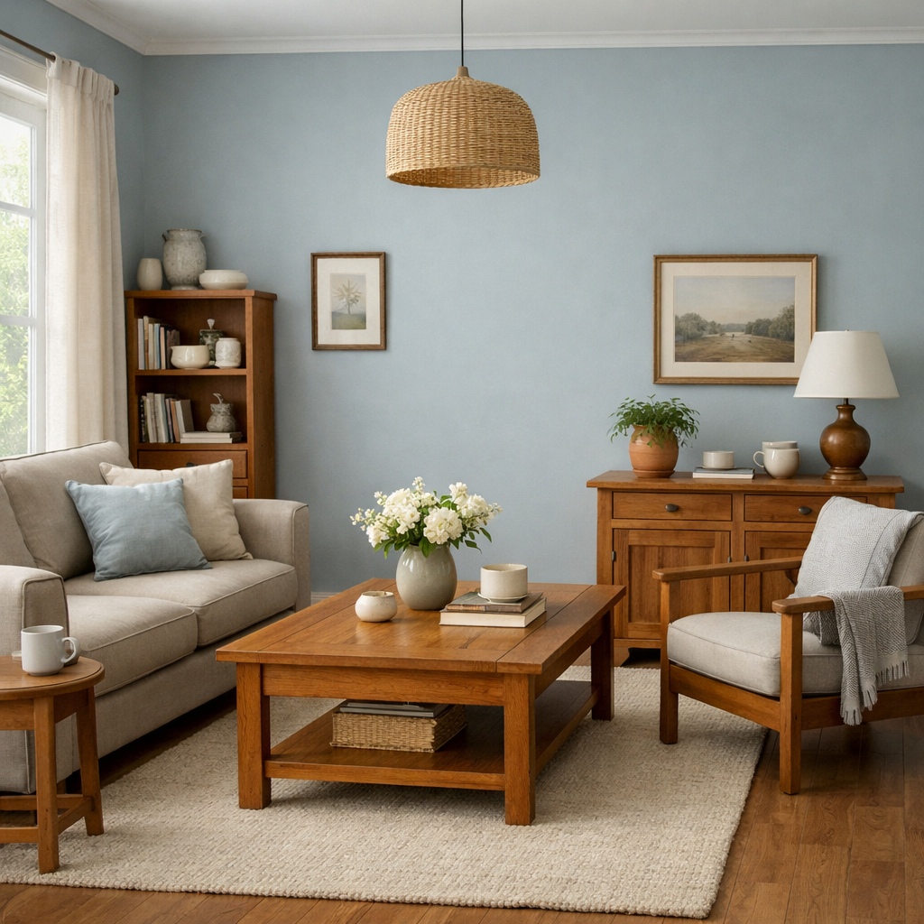 In living rooms, accents are often better introduced through furnishings, artwork, or textiles rather than paint. This keeps the core environment calm and adaptable.