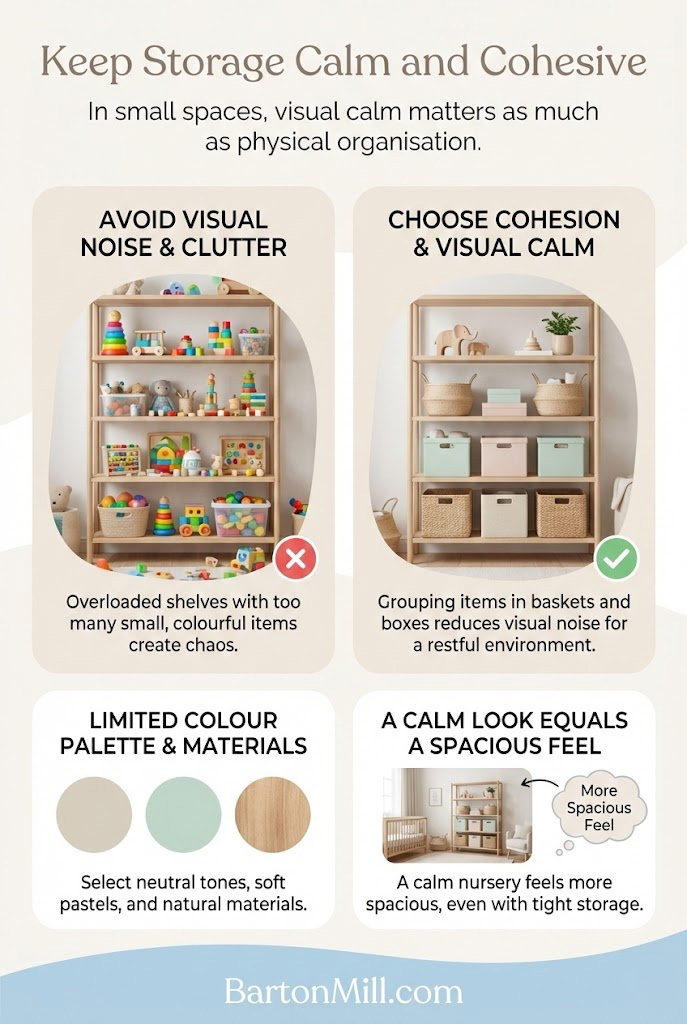 A calm looking nursery often feels more spacious, even when storage is tight.