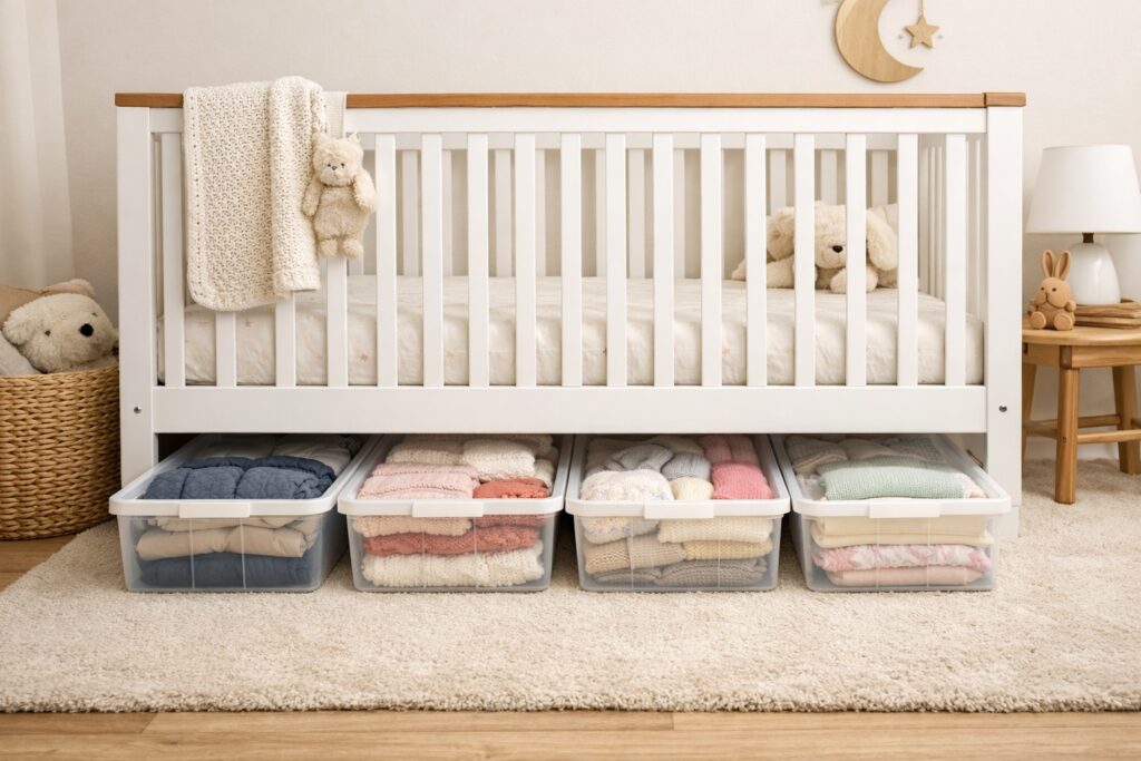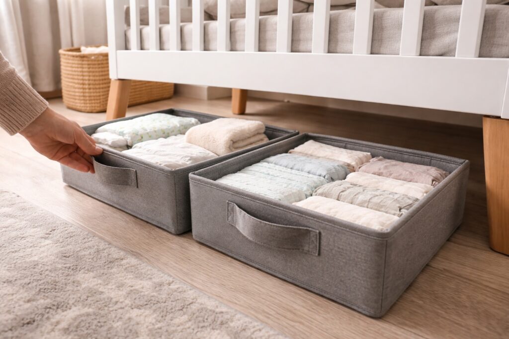 Keeping under-cot storage organised prevents it from becoming a forgotten dumping ground.