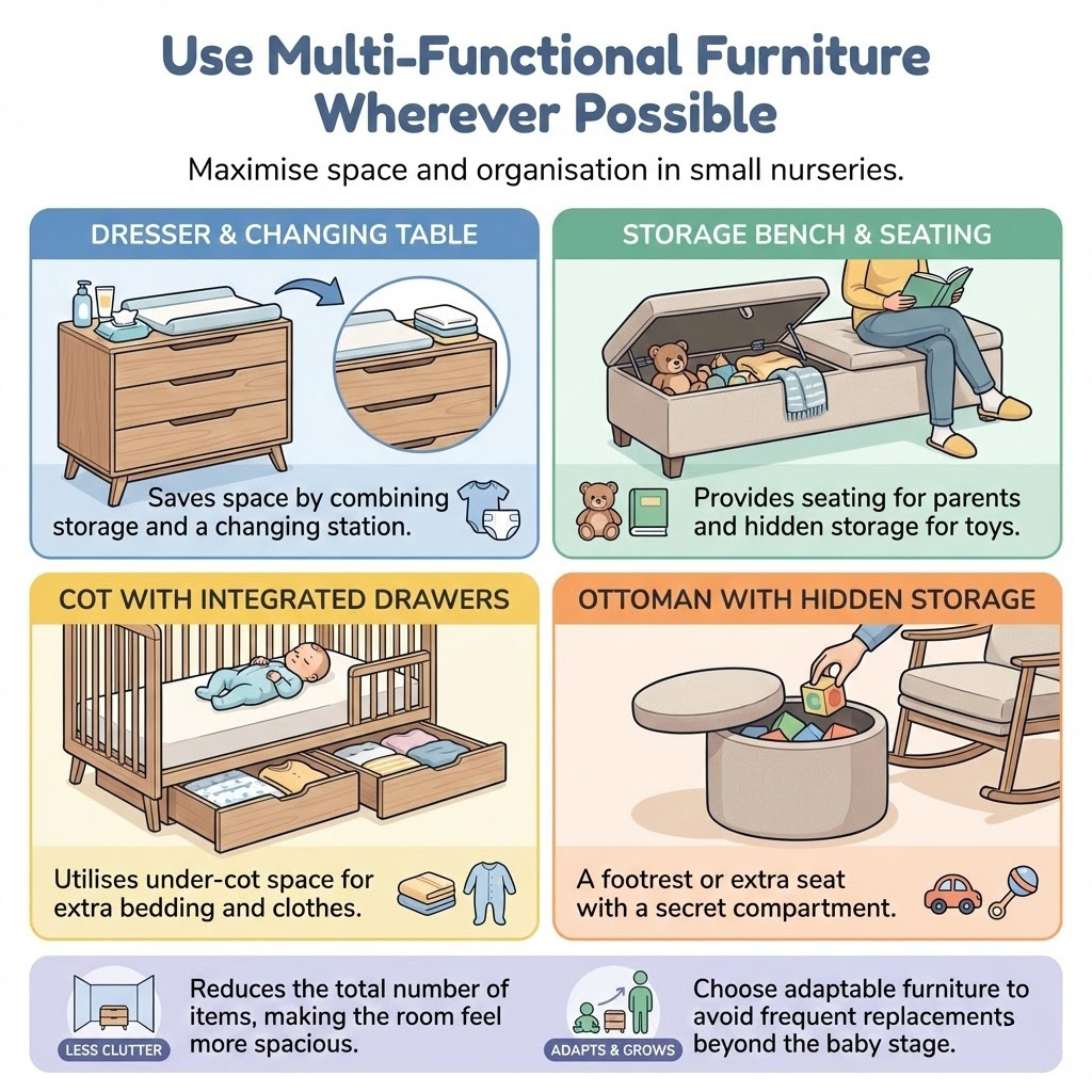 Multi-purpose furniture is essential in small nurseries.