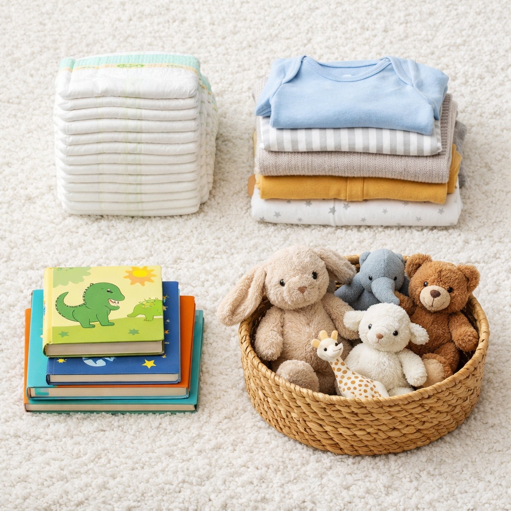 Less than most parents expect. Focus on everyday essentials and store future items elsewhere if possible.