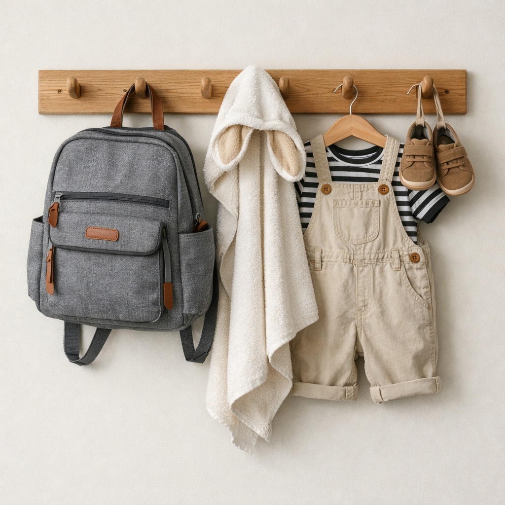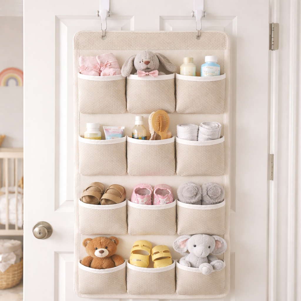 Over-the-door organisers can hold shoes, accessories, toys, or nappy supplies without taking up floor space. Wall-mounted pockets or peg rails can store everyday items while keeping them visible and accessible.
