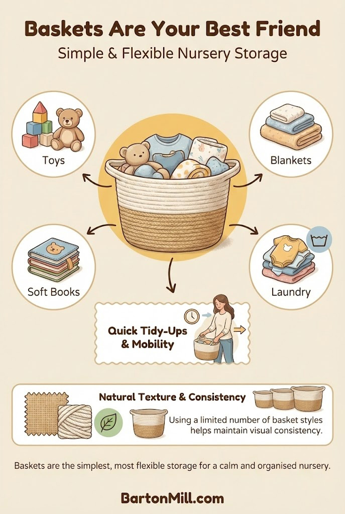 Baskets are one of the simplest and most flexible storage tools for nurseries.