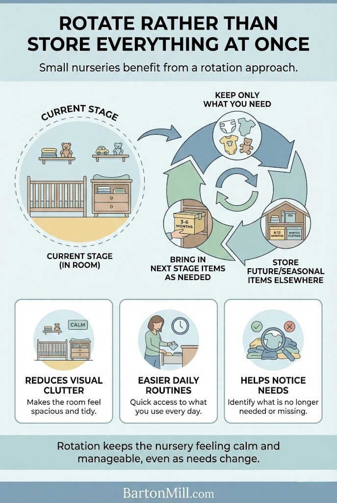 Rotation keeps the nursery feeling calm and manageable, even as needs change.