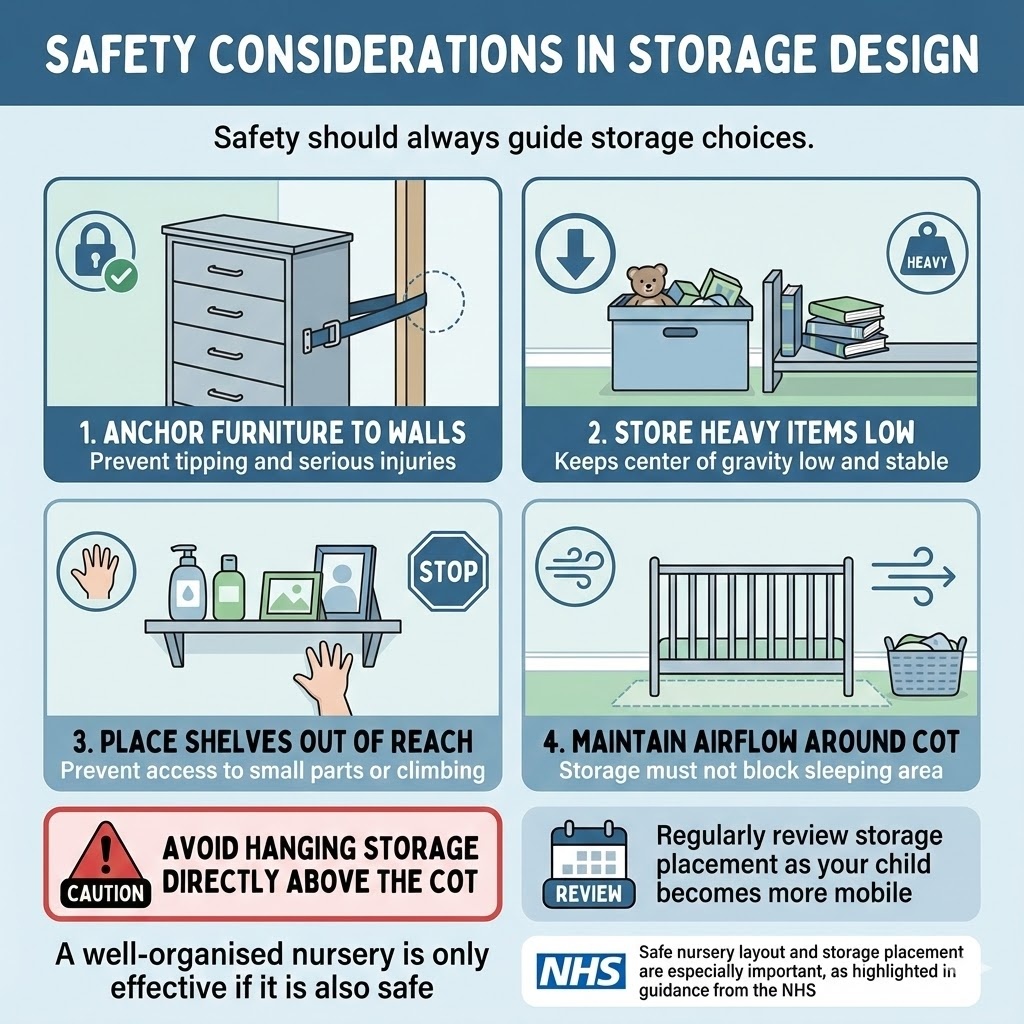 Safe nursery layout and storage placement are especially important, as highlighted in guidance from the NHS (UK) and the American Academy of Pediatrics (US).