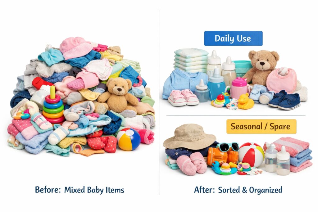 Keep only what you need for the current stage in the room. Store larger sizes, seasonal clothing, or future items elsewhere if possible.