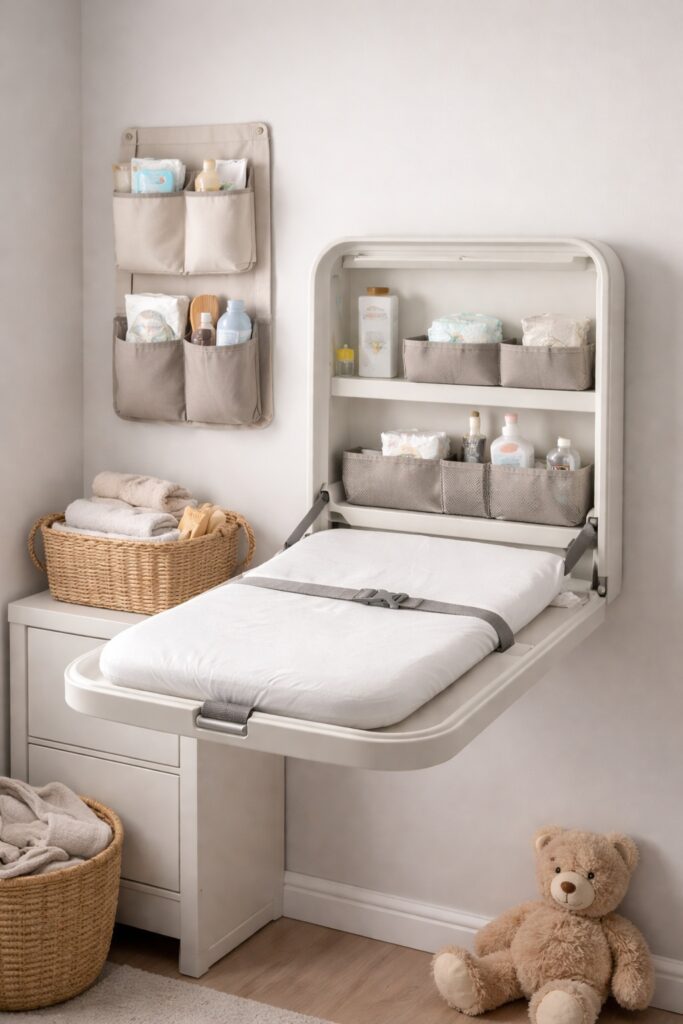 Changing tables with drawers or shelves can store nappies, wipes, creams, and spare outfits. If your changing table is simple or wall-mounted, adding baskets or organisers underneath can dramatically increase storage.