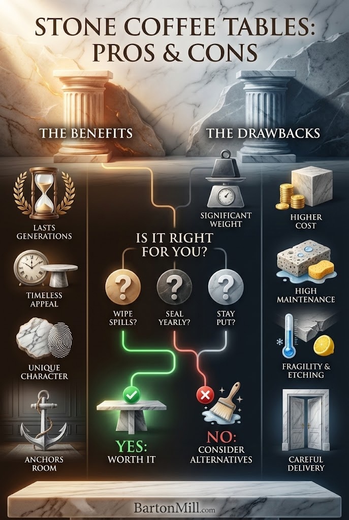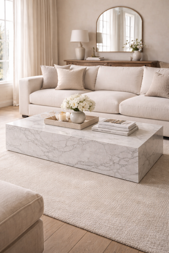 A stone coffee table asks you to think about materials, maintenance, and longevity in ways that disposable furniture does not. That consideration is part of the point.