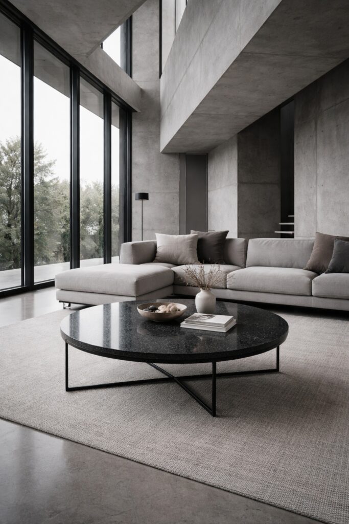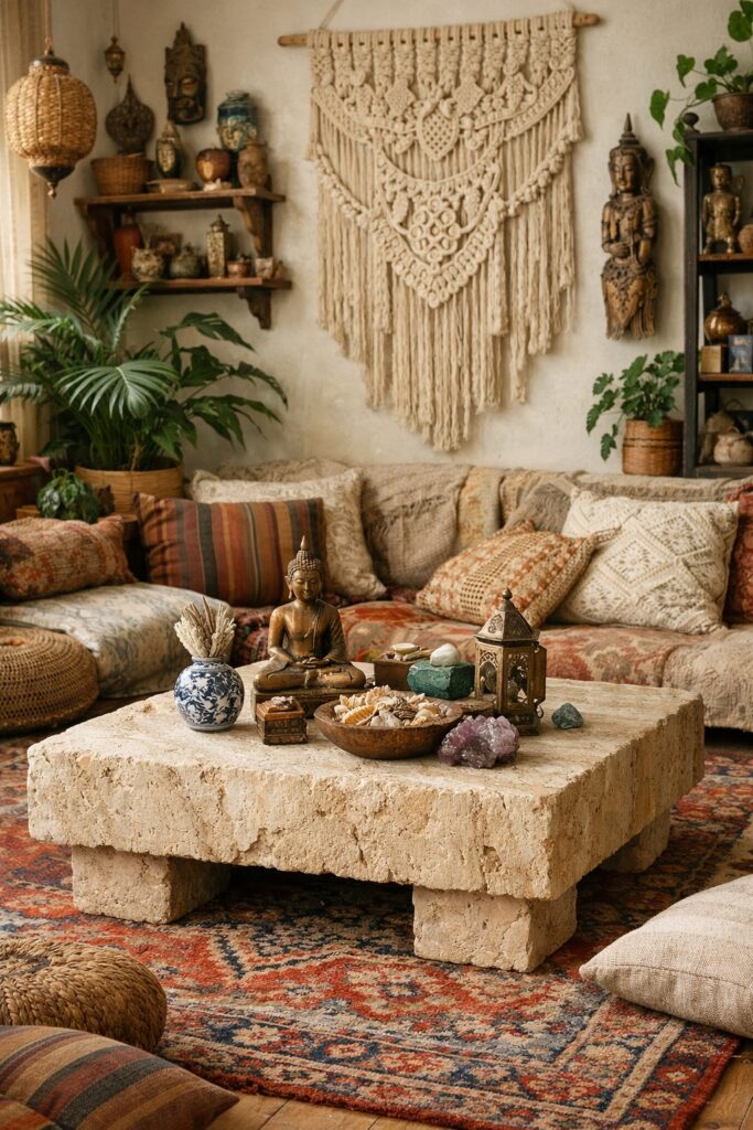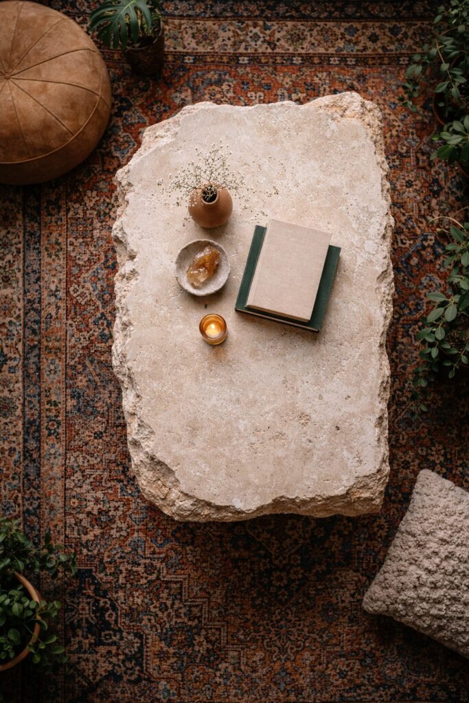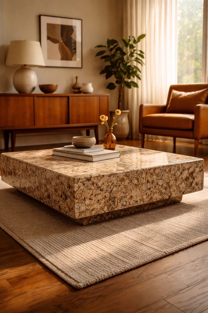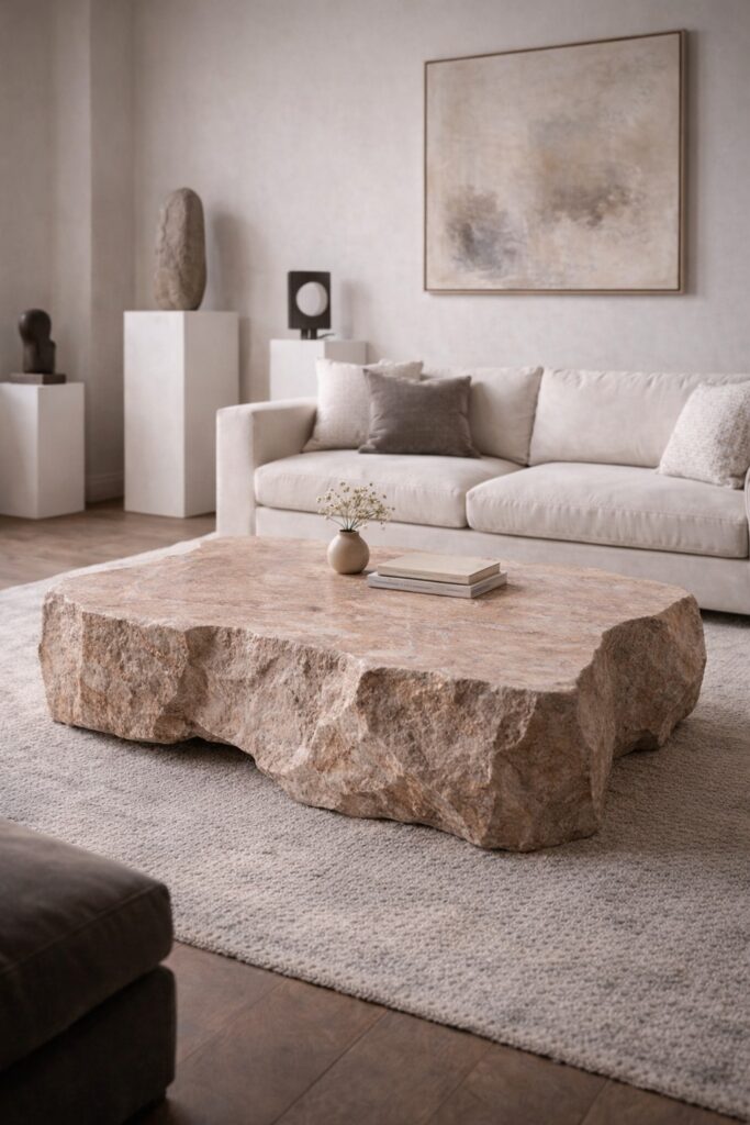 Stone anchors a room and provides a focal point that lighter furniture cannot achieve.