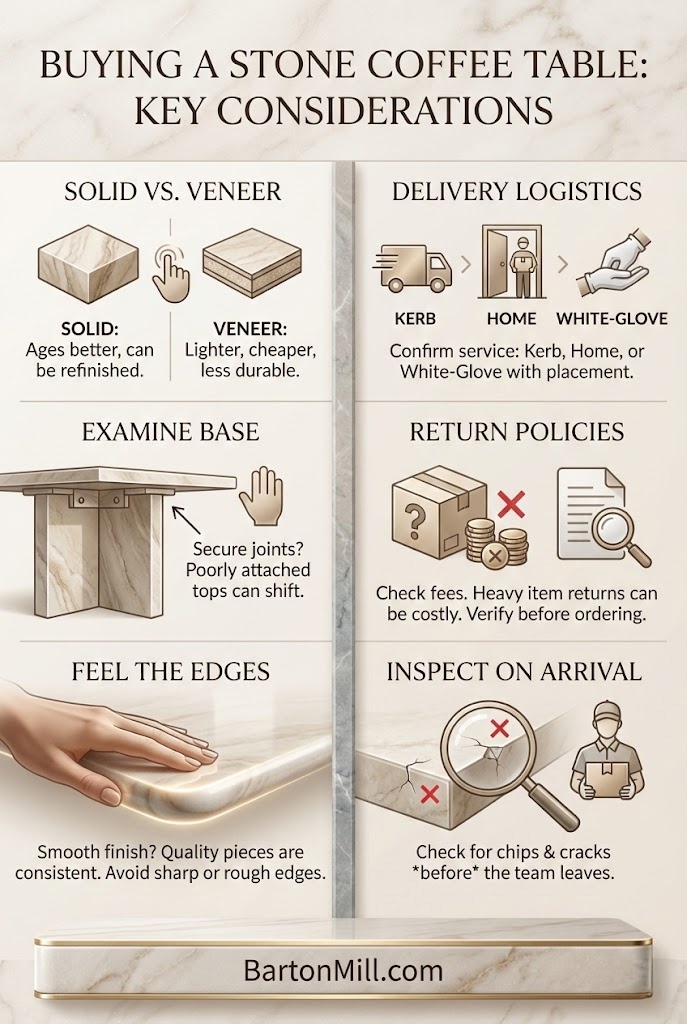 Check whether you are buying solid stone or veneer. Solid ages better and can be refinished. Veneer is lighter and cheaper but less durable.
