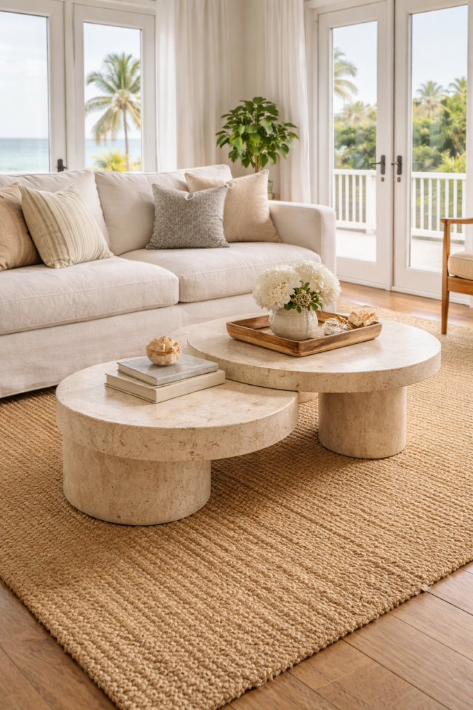 Proportion matters. A coffee table usually works best at roughly two-thirds the length of the sofa. Too small looks lost. Too large takes over.