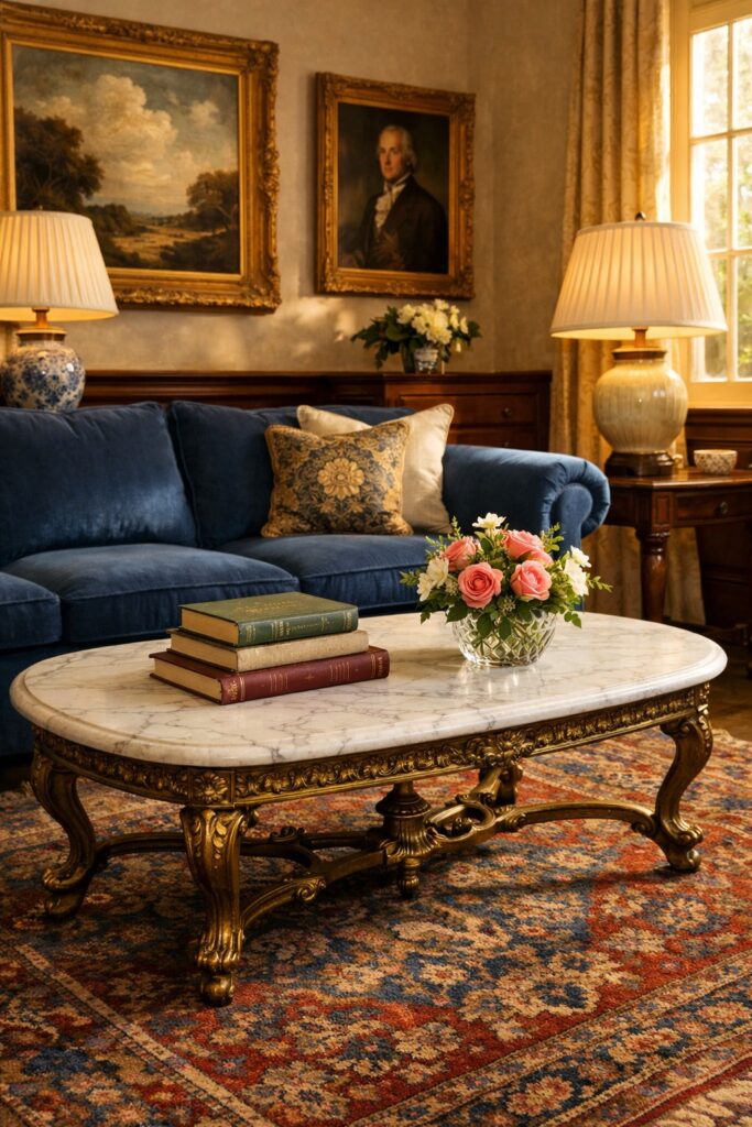 Marble has been used in formal rooms for centuries. A marble table with brass or ornate base suits traditional interiors with antiques and rich fabrics. Green marble has strong history in English and European rooms.