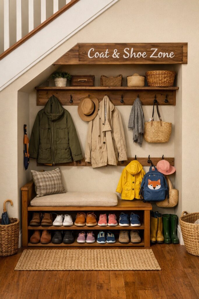 Under the stairs is ideal for shoes, coats, cleaning supplies, pantry items, or household overflow storage.