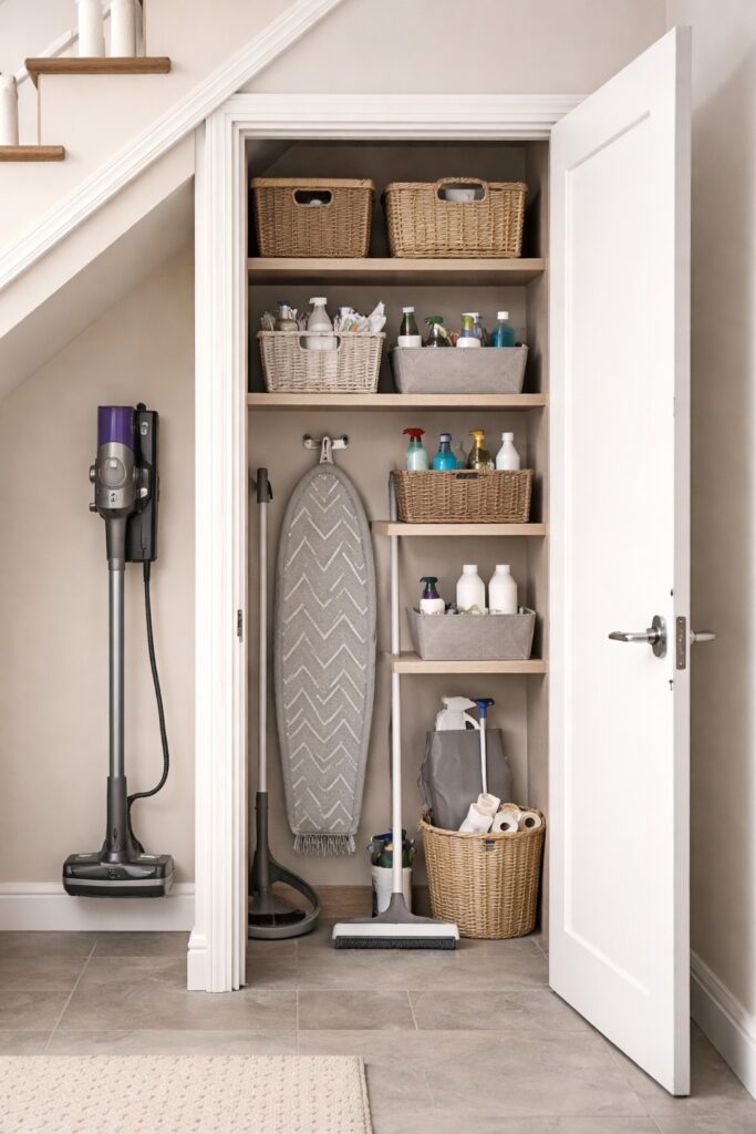 Under-stairs cupboards are often used to store cleaning supplies, vacuums, and household equipment.