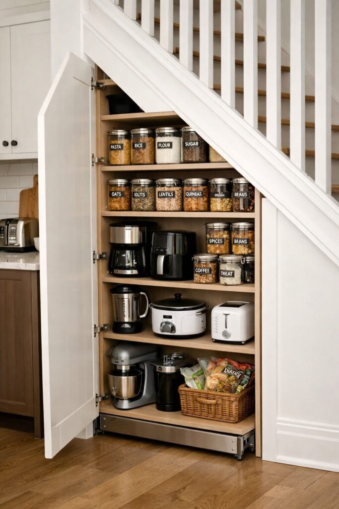 In homes where kitchen space is limited, the cupboard under the stairs can work well as a pantry or food storage area.
