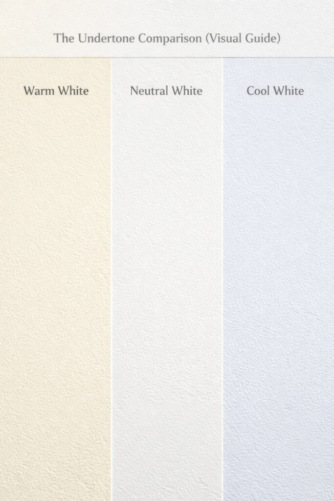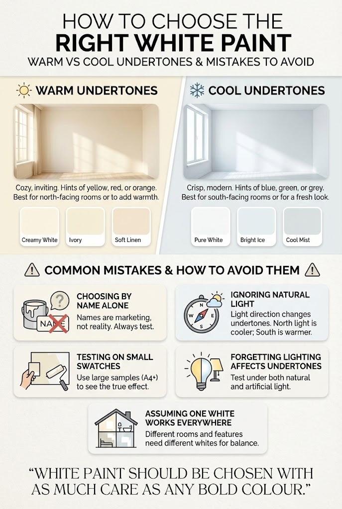 When comparing warm vs cool white paint, the key difference lies in how undertones respond to light and surrounding materials rather than how white the colour appears in the tin.
