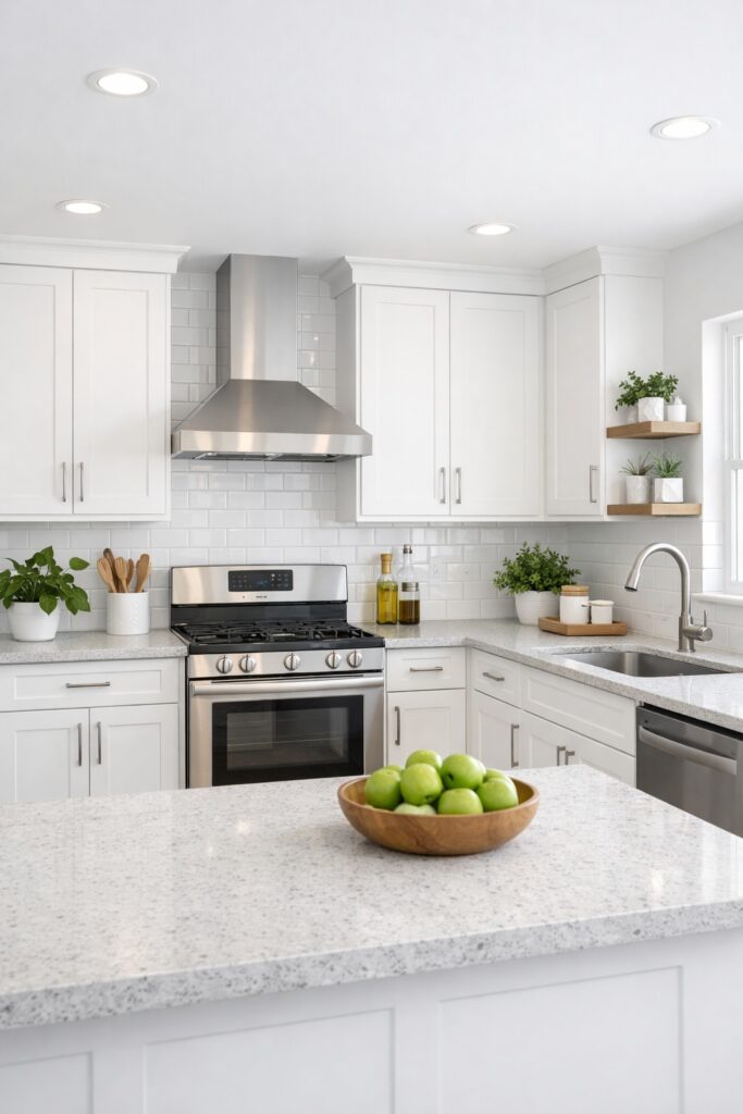 Cool or balanced whites keep kitchens feeling fresh and bright. They work well with white units, stone worktops, and reflective surfaces.